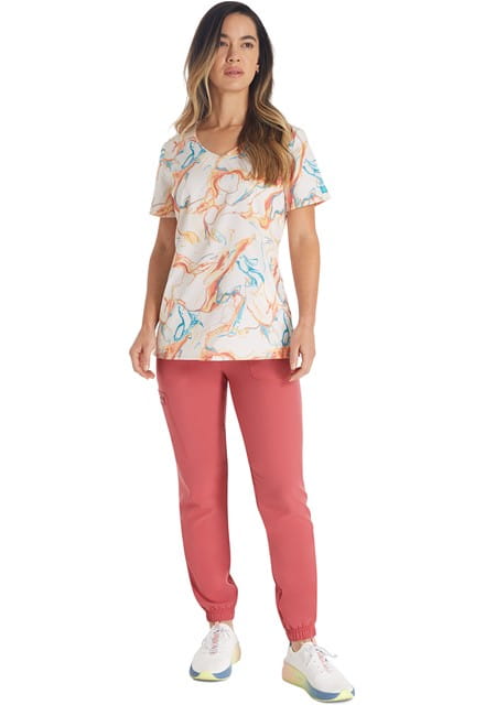 Bluza medyczna damska z dekoltem w kształcie litery V we wzory tie dye. Posiada dwie pojemne kieszenie. Boczne rozcięcia zwiększają komfort pracy.