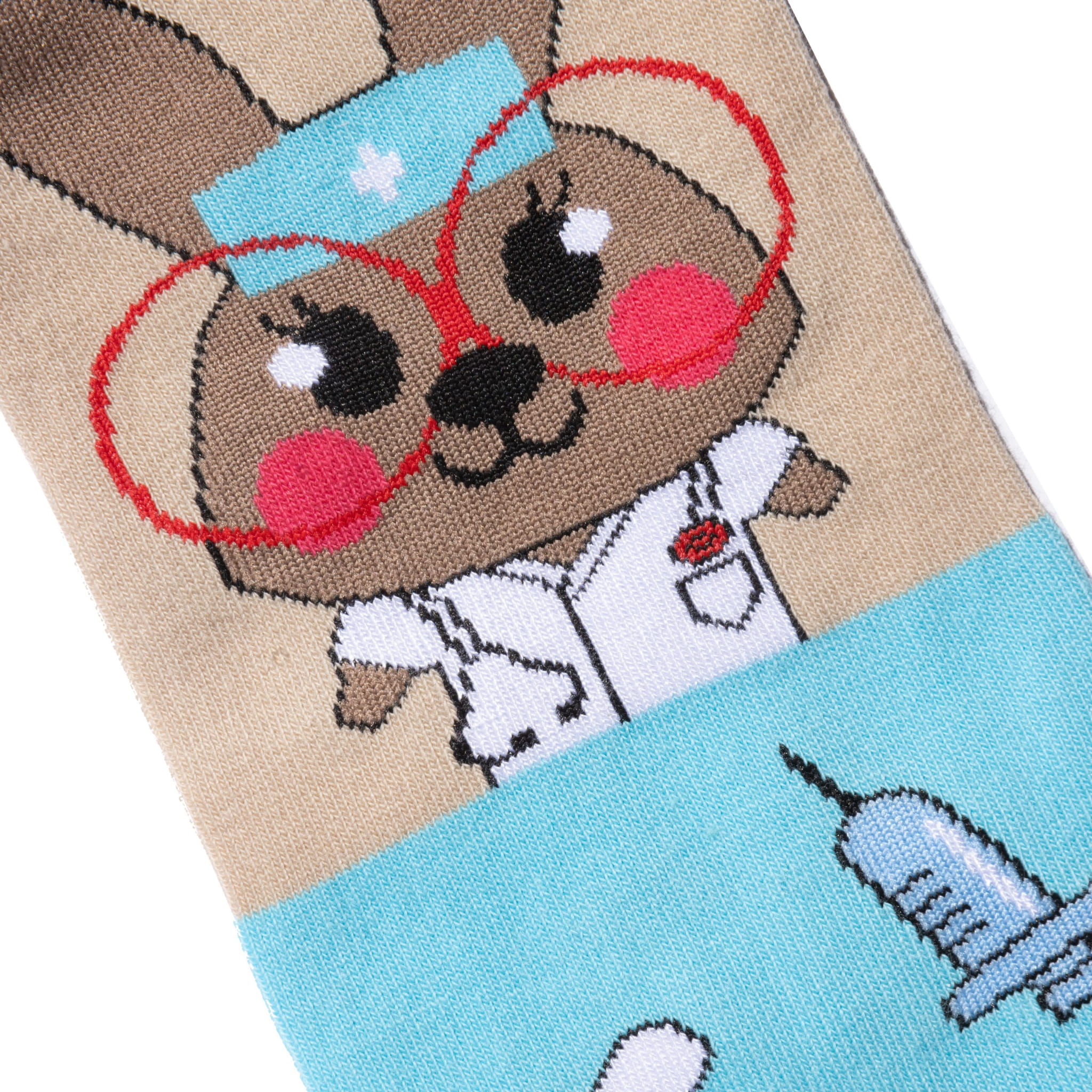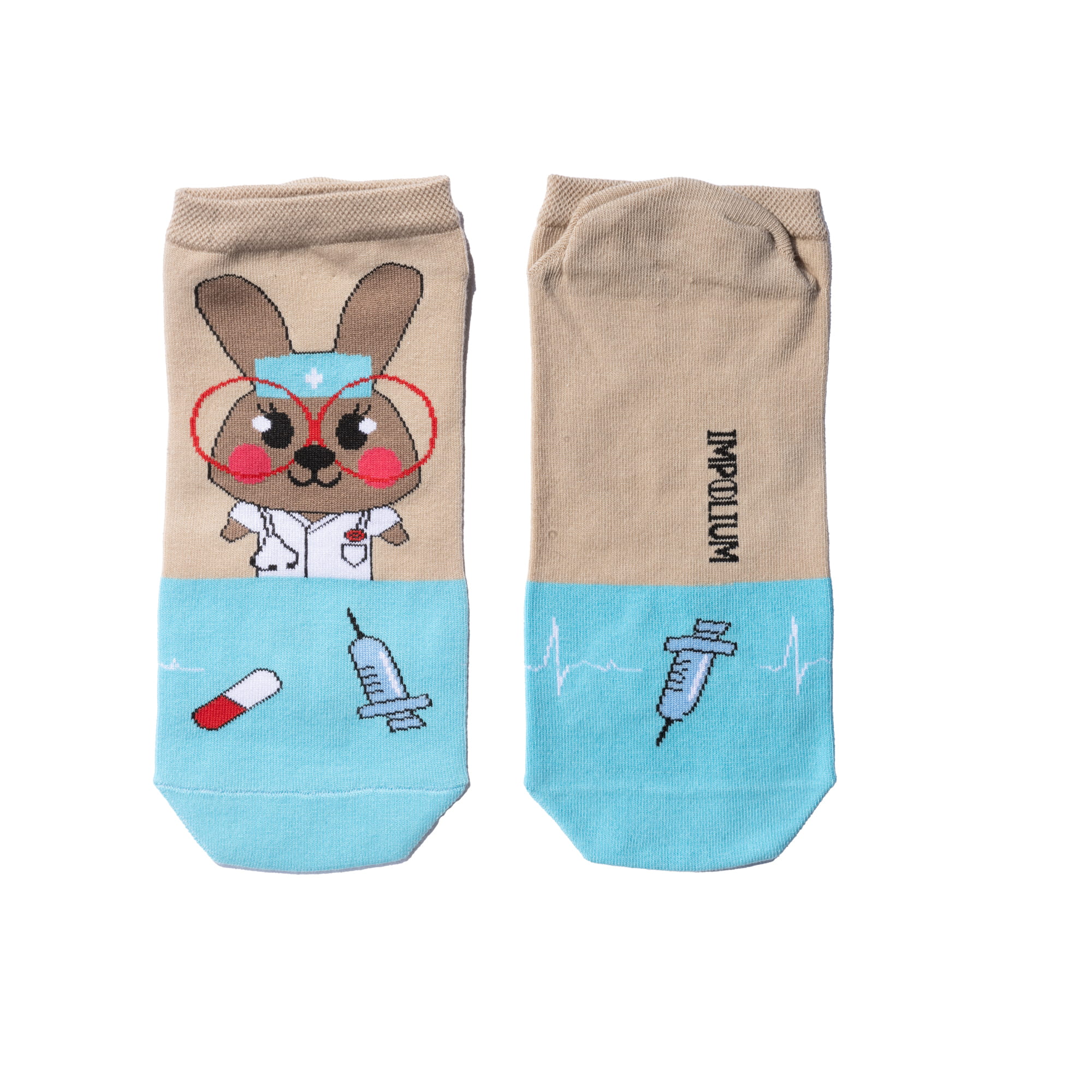 Krótkie skarpetki na których dumnie króluje doktor Królikowa na ściągaczu! Resztę skarpetki zdobią strzykawki, wykresy EKG i pigułki. Skarpetki posiadają szeroki ściągacz, zadbają o komfort twoich stóp podczas długiego dnia pracy.