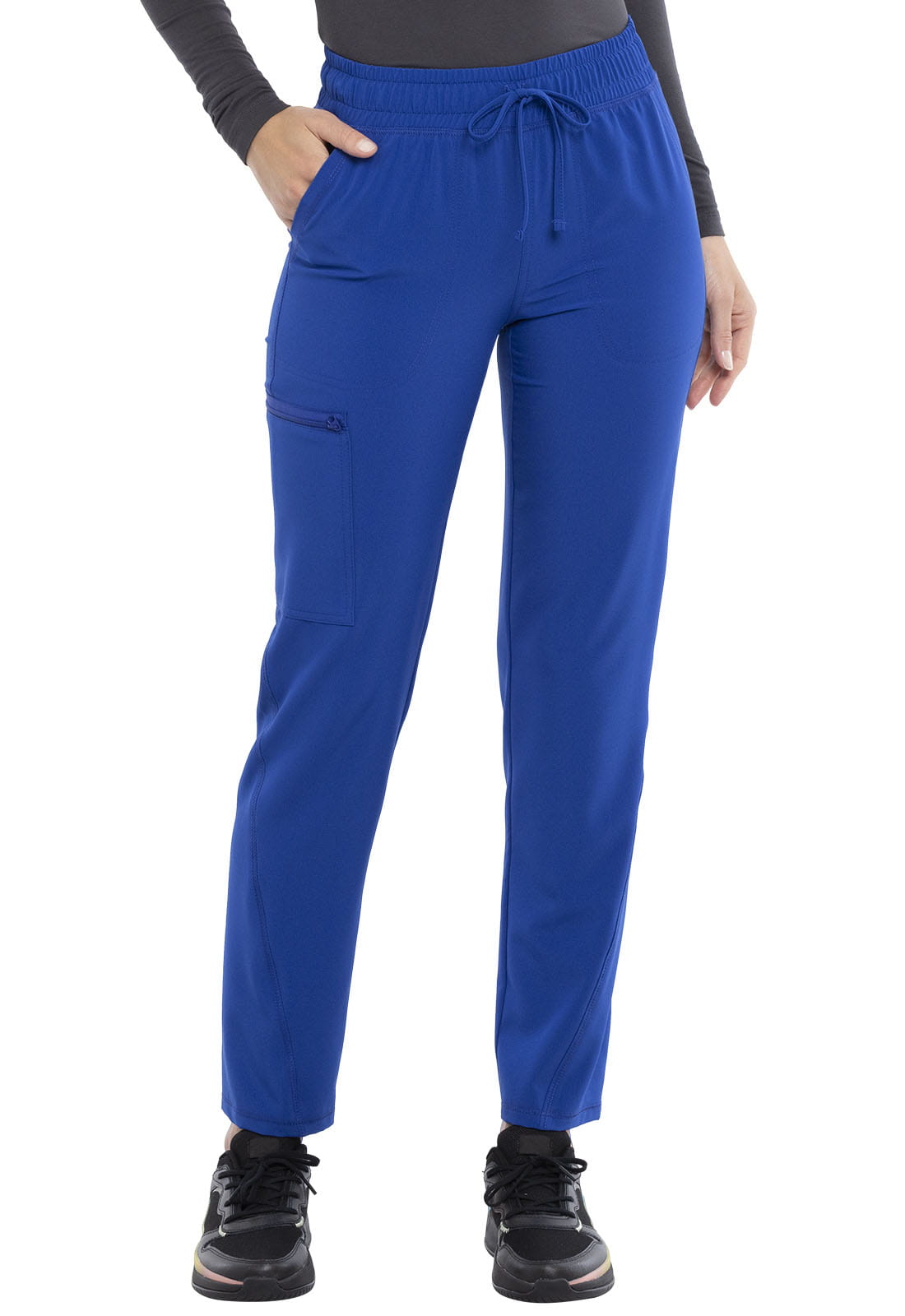 Spodnie medyczne damskie Allura, wyposażone są w gumę w pasie wraz ze sznurkiem. Posiadają pięć kieszeni: dwie przednie, jedna kieszeń cargo zapinana na zamek i dwie naszywane kieszenie tylne.
